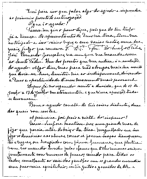 | « Je devrai, pour cela, parler un peu du secret et répondre à la première question. En quoi consiste le secret? Il me semble que je peux le dire puisque le Ciel m’en a déjà donné la permission. Les représentants de Dieu sur la terre m’ont eux aussi autorisée à le faire, à plusieurs reprises, par lettres. Je crois que Votre Excellence a conservé l’une d’elles, celle du Père José Bernardo Gonçalves, dans laquelle il m’ordonne d’écrire au Saint-Père. Un des points qu’il m’indique est la révélation du secret. J’en ai déjà dit quelque chose, mais pour ne pas trop allonger cet écrit, qui devait être bref, je me suis limitée à l’indispensable, laissant à Dieu l’occasion d’un moment plus favorable. J’ai déjà exposé, dans le deuxième écrit, le doute qui m’avait tourmentée du 13 juin au 13 juillet, et qui disparut lors de cette dernière apparition. Bien. Le secret comporte trois choses distinctes, et je vais en dévoiler deux. La première fut la vision de l’Enfer. Notre-Dame nous montra une grande mer de feu, qui paraissait se trouver sous la terre et, plongés dans ce feu, les démons et les âmes, comme s’ils étaient des braises transparentes, noires ou bronzées, avec une forme humaine. Ils flottaient dans cet incendie, soulevés par les flammes, qui sortaient d’eux-mêmes, avec des nuages de fumée. Ils retombaient de tous côtés, comme les étincelles retombent dans les grands incendies, sans poids ni équilibre, avec des cris et des gémissements de douleur et de désespoir qui horrifiaient et faisaient trembler de frayeur. Les démons se distinguaient par leurs formes horribles et dégoûtantes d’animaux épouvantables et inconnus, mais transparents et noirs. Cette vision dura un moment, grâce à notre bonne Mère du Ciel qui auparavant nous avait prévenus, nous promettant de nous emmener au Ciel (à la première apparition). Autrement, je crois que nous serions morts d’épouvante et de peur. Ensuite nous levâmes les yeux vers Notre-Dame, qui nous dit avec bonté et tristesse: — Vous avez vu l’enfer où vont les âmes des pauvres pécheurs. Pour les sauver, Dieu veut établir dans le monde la dévotion à mon Cœur immaculé. Si l’on fait ce que je vais vous dire, beaucoup d’âmes seront sauvées et on aura la paix. La guerre va finir. Mais si l’on ne cesse d’offenser Dieu, sous le pontificat de Pie XI en commencera une autre pire encore. Lorsque vous verrez une nuit illuminée par une lumière inconnue, sachez que c’est le grand signe que Dieu vous donne, qu’Il va punir le monde de ses crimes par le moyen de la guerre, de la faim et des persécutions contre l’Église et le Saint-Père. Pour empêcher cette guerre, je viendrai demander la consécration de la Russie à mon Cœur immaculé et la communion réparatrice des premiers samedis. Si on accepte mes demandes, la Russie se convertira et on aura la paix; sinon elle répandra ses erreurs à travers le monde, provoquant des guerres et des persécutions contre l’Église. Les bons seront martyrisés, le Saint-Père aura beaucoup à souffrir, diverses nations seront détruites. À la fin, mon Cœur immaculé triomphera. Le Saint-Père me consacrera la Russie, qui se convertira, et il sera concédé au monde un certain temps de paix ». |