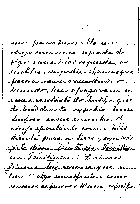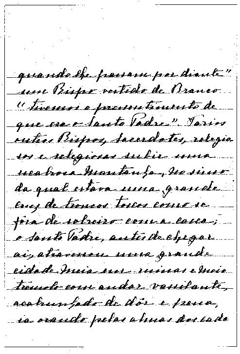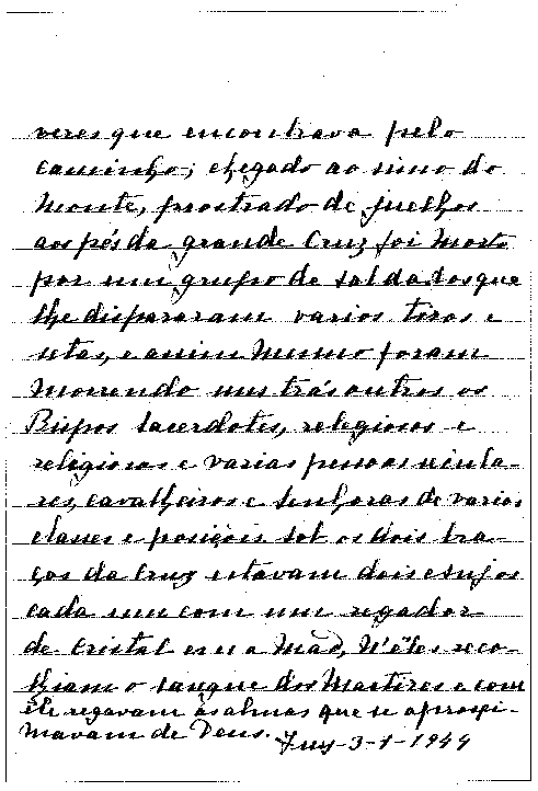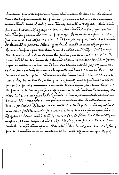 | La troisième partie du secret révélé le 13 juillet 1917 dans la Cova de Iria-Fatima. J’écris en obéissance à Vous, mon Dieu, qui me le commandez par l’intermédiaire de son Exce Rév.me Monseigneur l’Évêque de Leiria et de Votre Très Sainte Mère, qui est aussi la mienne. Après les deux parties que j’ai déjà exposées, nous avons vu sur le côté gauche de Notre-Dame, un peu plus en hauteur, un Ange avec une épée de feu dans la main gauche; elle scintillait et émettait des flammes qui, semblait-il, devaient incendier le monde; mais elles s’éteignaient au contact de la splendeur qui émanait de la main droite de Notre-Dame en direction de lui; l’Ange, indiquant la terre avec sa main droite, dit d’une voix forte: Pénitence! Pénitence! Pénitence! Et nous vîmes dans une lumière immense qui est Dieu: “Quelque chose de semblable à la manière dont se voient les personnes dans un miroir quand elles passent devant” un Évêque vêtu de Blanc, “nous avons eu le pressentiment que c’était le Saint-Père”. Divers autres Évêques, Prêtres, religieux et religieuses monter sur une montagne escarpée, au sommet de laquelle il y avait une grande Croix en troncs bruts, comme s’ils étaient en chêne-liège avec leur écorce; avant d’y arriver, le Saint-Père traversa une grande ville à moitié en ruine et, à moitié tremblant, d’un pas vacillant, affligé de souffrance et de peine, il priait pour les âmes des cadavres qu’il trouvait sur son chemin; parvenu au sommet de la montagne, prosterné à genoux au pied de la grande Croix, il fut tué par un groupe de soldats qui tirèrent plusieurs coups avec une arme à feu et des flèches; et de la même manière moururent les uns après les autres les Évêques les Prêtres, les religieux et religieuses et divers laïcs, hommes et femmes de classes et de catégories sociales différentes. Sous les deux bras de la Croix, il y avait deux Anges, chacun avec un arrosoir de cristal à la main, dans lequel ils recueillaient le sang des Martyrs et avec lequel ils irriguaient les âmes qui s’approchaient de Dieu. |